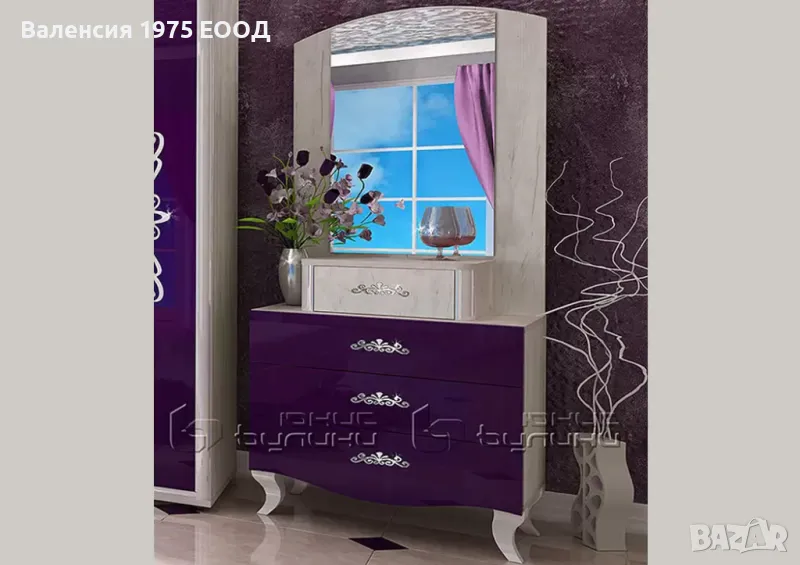 Спалнята е с тапицирана табла с лилаво кадифе и кристални камъни, с повдигащ амортисьорен механизъм за матрак 160/ 200 см.