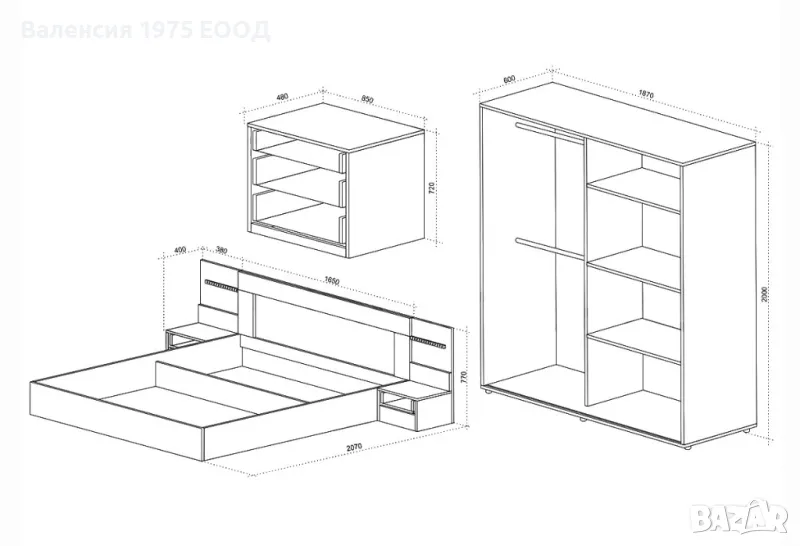 Спалнята е с табла с LED осветление с дистанционно( възможност за смяна на цвета на светлината) и с повдигащ амортисьорен механизъм за матрак 160/ 200 см.