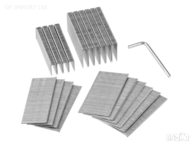Включени аксесоари: 500 скоби тип 55 (200 à 15 mm / 300 à 25 mm), 500 пирона тип 47 (200 à 25 mm / 300 à 32 mm), 1 шестограмен ключ