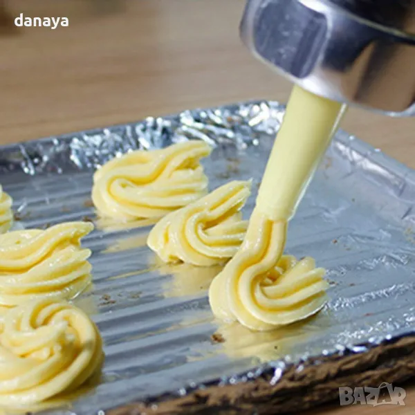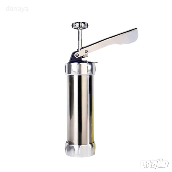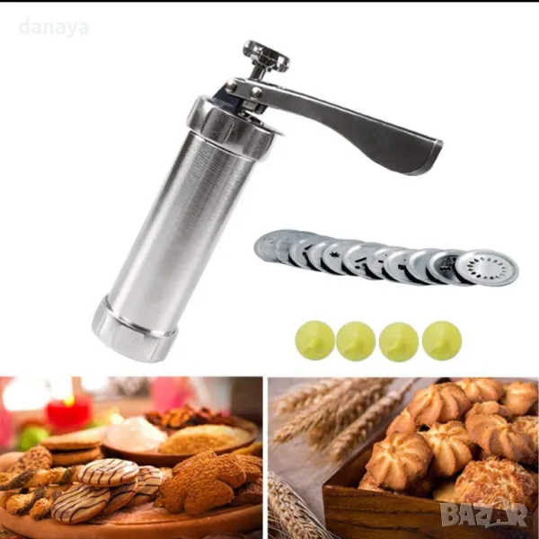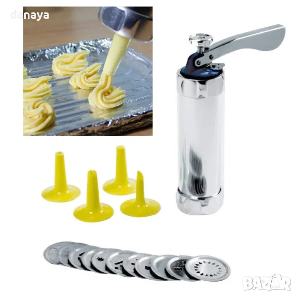 Сладкарски метален шприц с 10 шаблона дискове за правене на различни по форма дребни сладки. Към комплекта са включени и 4 броя пластмасови дюзи за шприцоване с различни мотиви. Удобен инструмент за оформяне на украси върху всякакъв вид сладкиши.