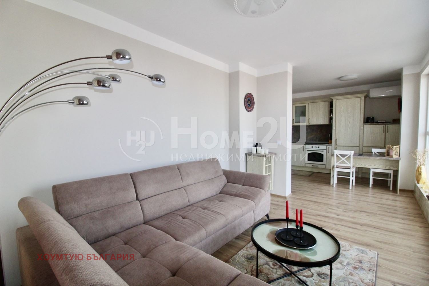 Просторен хол с кухненска част, с нови дизайнерски мебели и уреди.