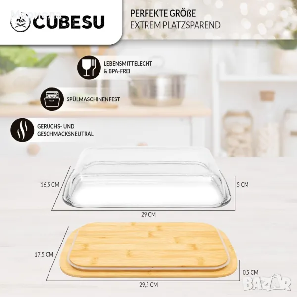Подходящи за почистване в съдомиялна машина – висококачественото боросиликатно стъкло на кутията за сирене може лесно да се почиства в съдомиялна машина заедно с приборите – бамбуковият капак трябва да се мие на ръка.