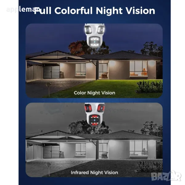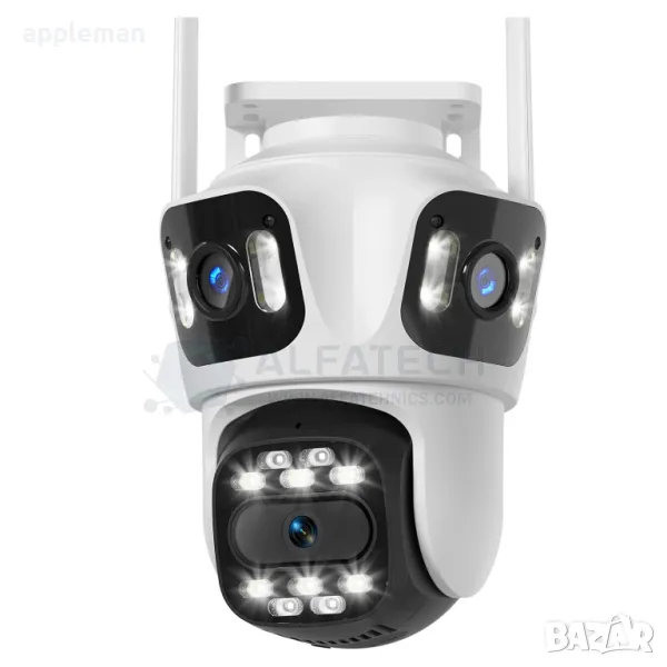 Тройна PTZ камера, 8 мегапиксела, детекция на движение, смарт аларма, IP66 защита, двупоточно аудио, цветно нощно виждане до 50м, слот за карта памет до 256GB.