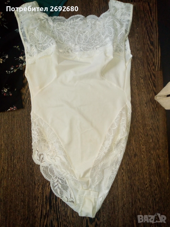 Бялото боди без ръкав няма етикет, но и то е ново, също като другите е размер L-ка, цена - 20лв.