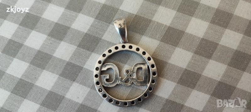 Висулка D&G (Долче и Габана) изработена от родирано сребро проба 925 ( маркирана, вижте снимките) ,украсена с циркони, тегло 6.88 грама, диаметър: 2.7 сантиметра..