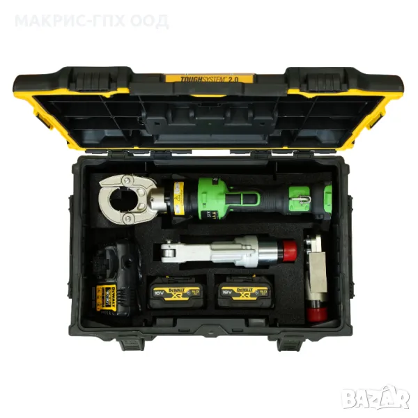 Основният уред в пластмасов куфар с отделения за пресоващите вложки, зарядно, 2 броя 5Аh батерии