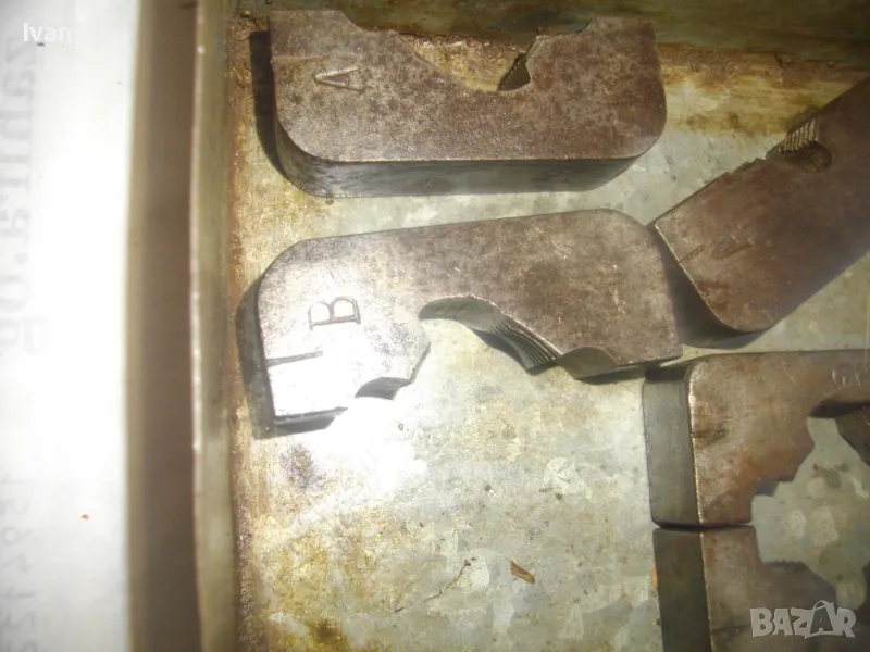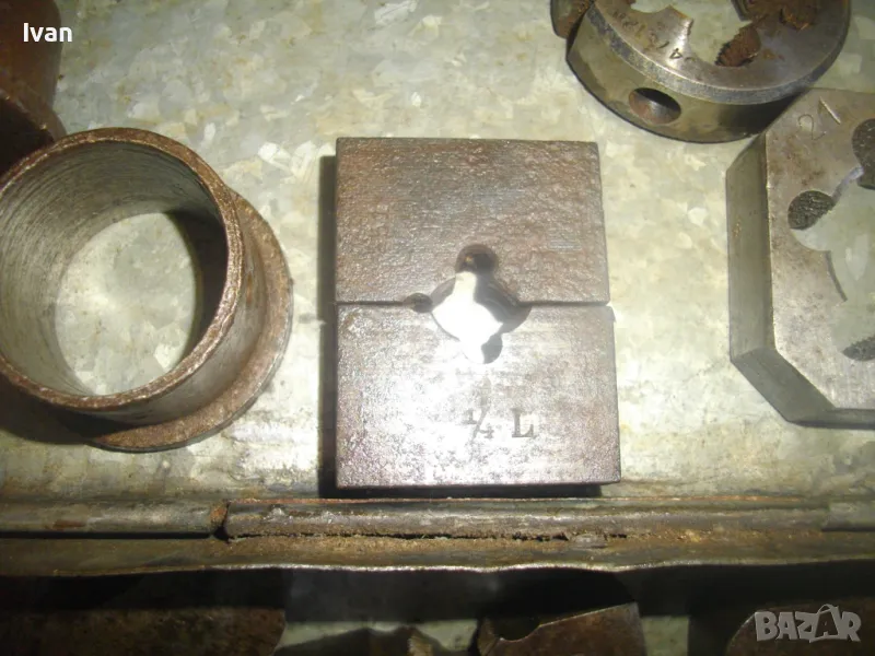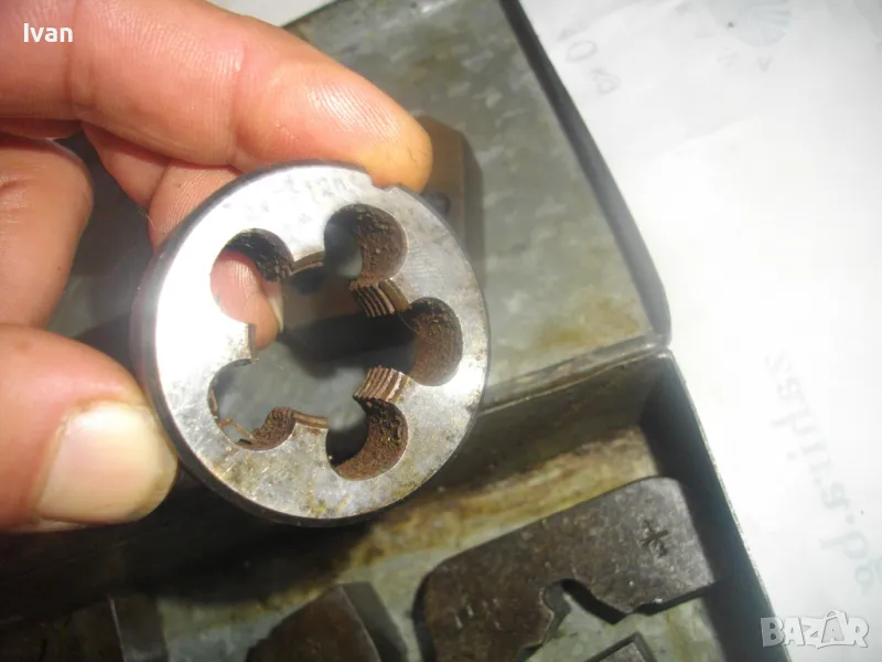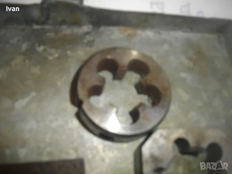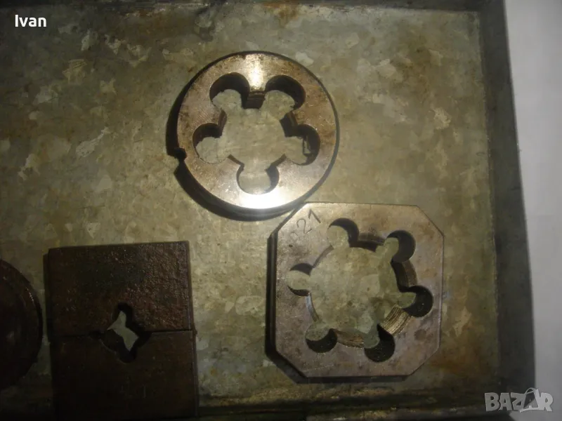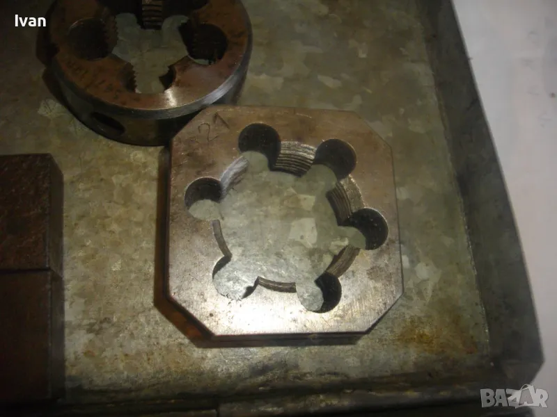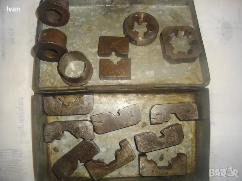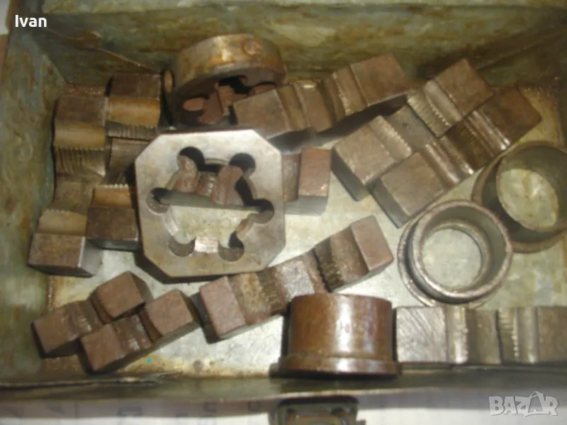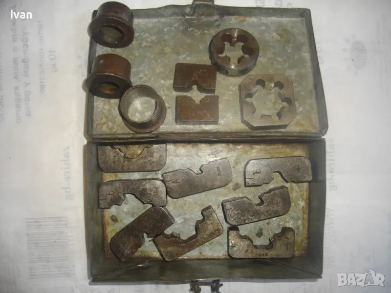 ОПИСАНИЕ на кутия с плашки за направа на външни резби на тръби. Цена 349 лв. (178.44 €). Старо качество. Професионални. Метална кутия с метална копчалка. Размери 200 х 120 х 55 мм. Плашки вътре - 18 мм - 1 бр, М21 - 1 бр, плашка цолова 1 цол - 2 броя ножове старо качество - марка GAS. В кутията иима още 6 бр. ножове за плашка размер 3/4 и 1/2 цол плюс 3 броя различен размер втулки, които се поставят отдолу от другата страна на плашка. Тегло на кутията с плашките - 3,0 кг.