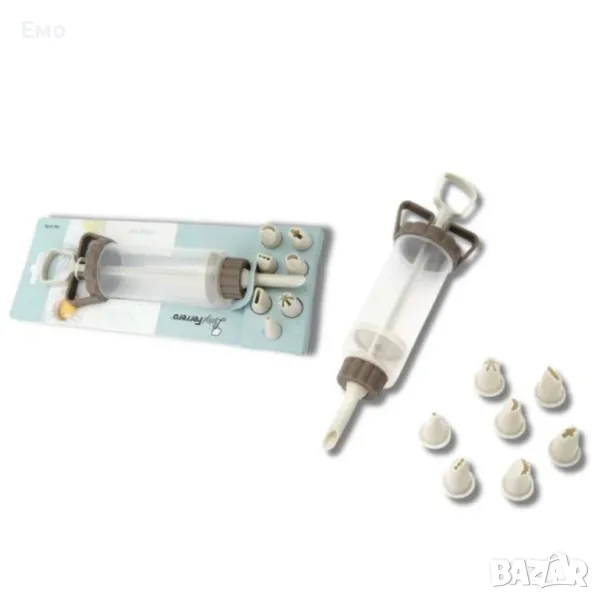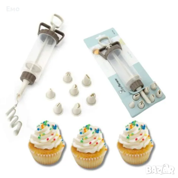 Удобен уред за оформяне на украси върху всякакъв вид бисквитки, торти и други сладкиши 8 бр пластмасови накрайника.