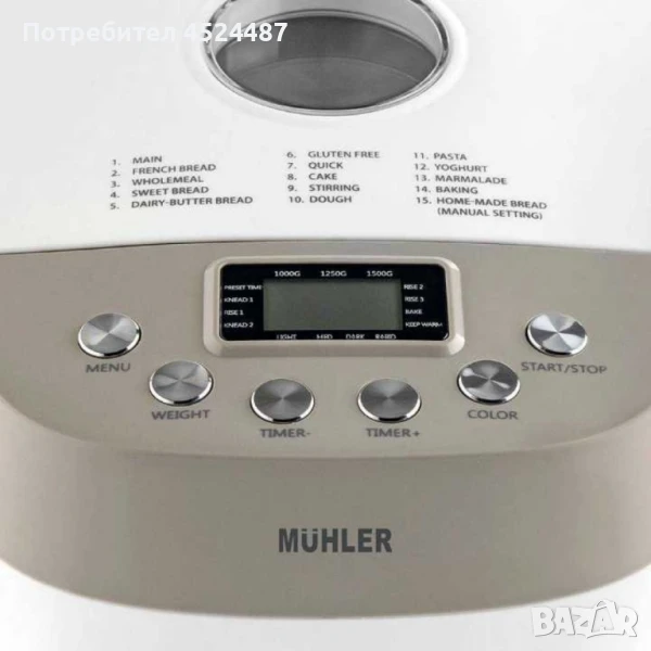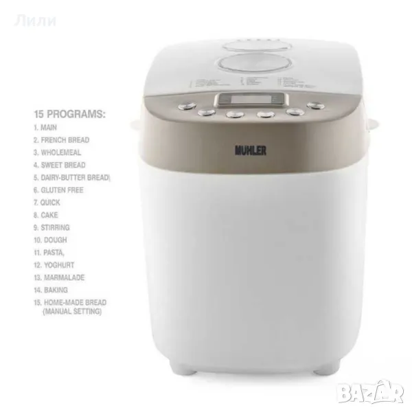 15 програми основна, френски хляб, пълнозърнест, сладък, млечно-маслен ,хляб, безглутенов, бърза, кекс, бъркане, замесване на тесто, тесто за паста, йогурт, мармалад, печене, домашен хляб ( ръчна настройка ).