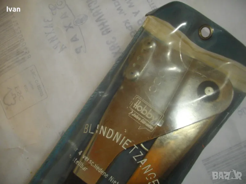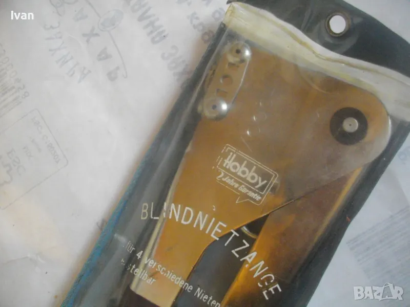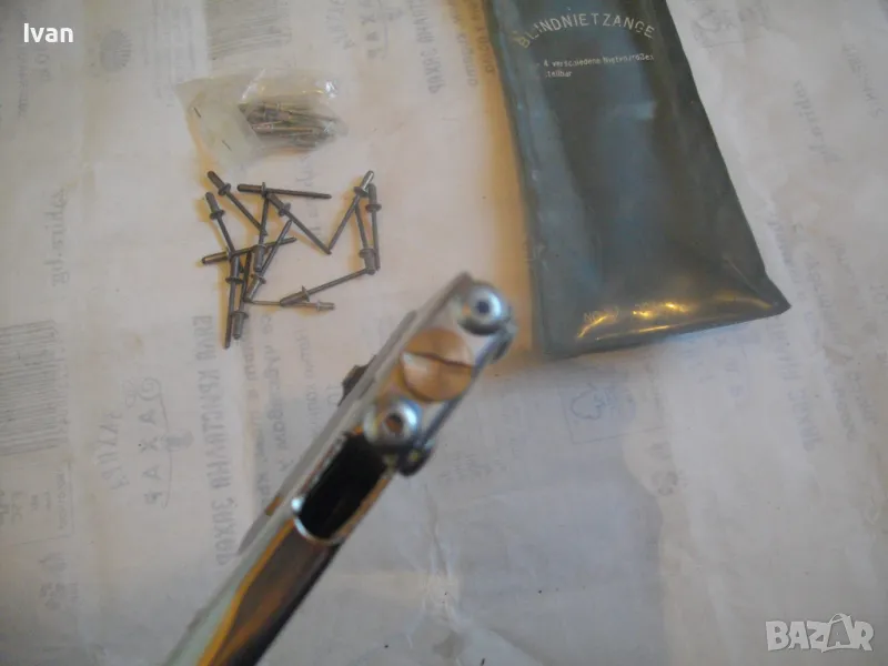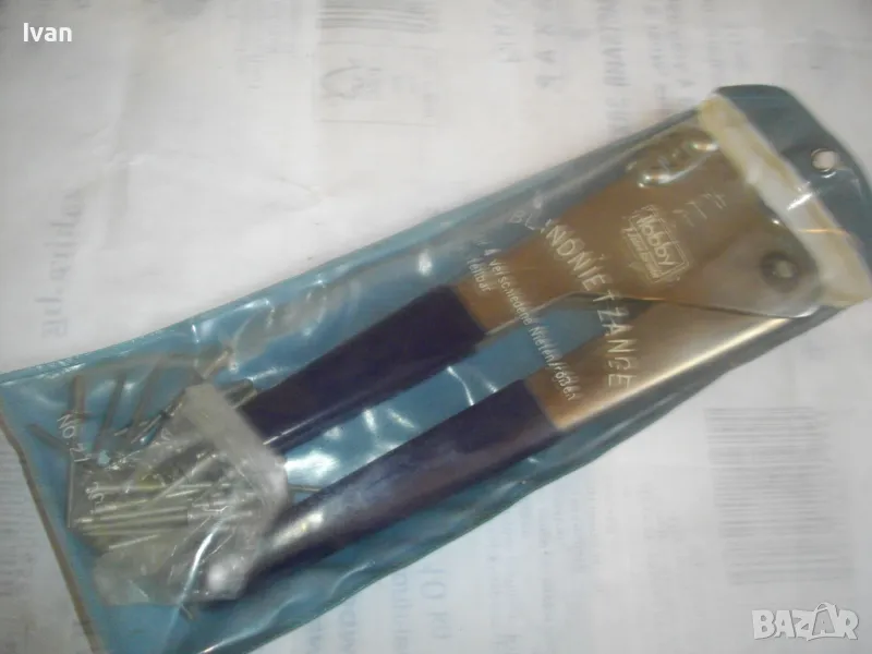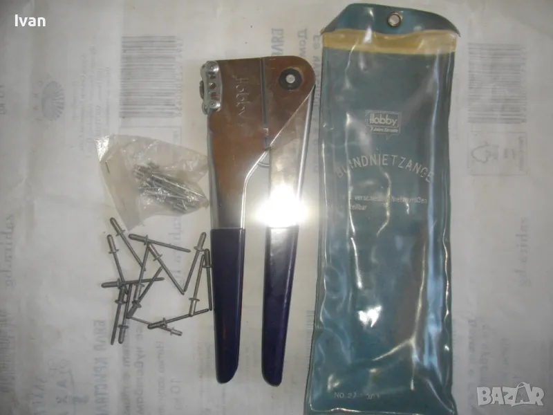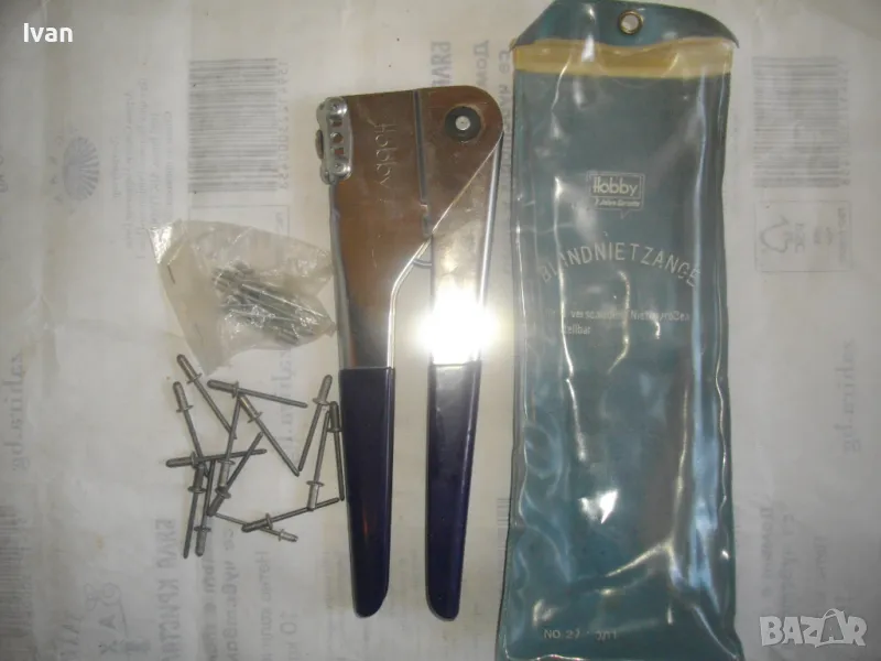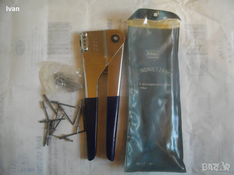 ОПИСАНИЕ на нитачкка поп-нитове. Цена 129 лв. Съвсем нова, неизползвана, немска оригинална. Старо качество инструмент, което в съвремието липсва. Марка и модел HOBBY №27. Нитачката е с 4 бр. различни глави размери до 3,5 мм. Към нея има оригинани нитове около 30 бр различни размери. Цялостна дължина 235 мм, ширина 80 мм, стоманен корпус с ПВЦ вложки на дръжките. Калъф оригинален ПВЦ найлонов към инструмента