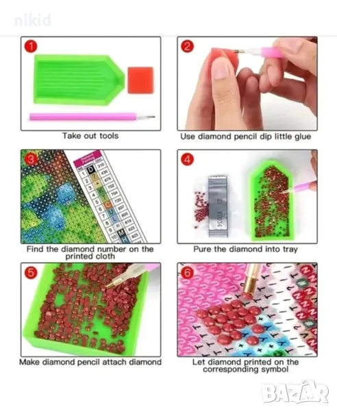 + купичка за мъниста и картина с фолио,която има готово нанесен слой лепило и по дадените цветове се залепват камъчета,много лесно,приятно и отморяващо,подходящо дори и за деца, не изисква особена сръчност и умения