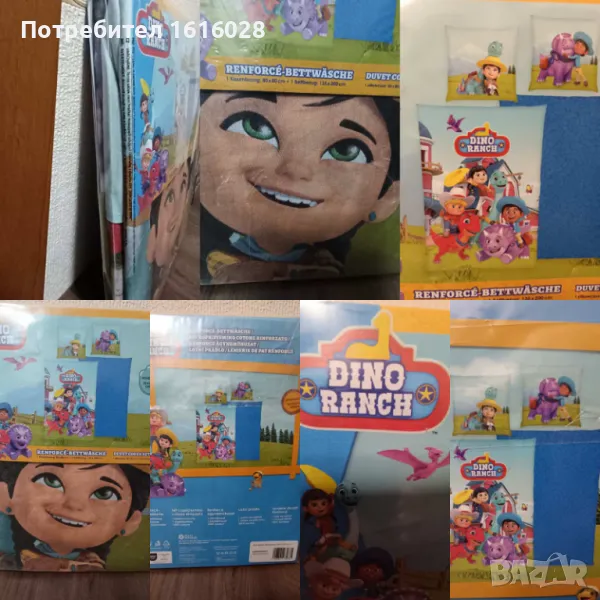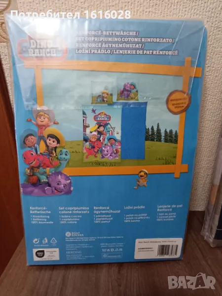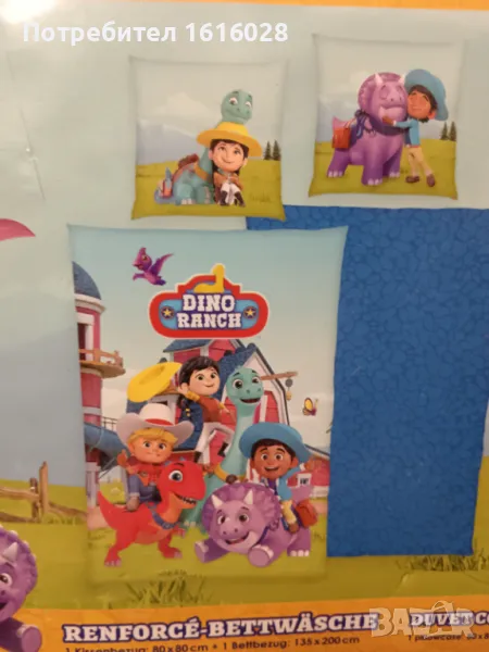 Спалното бельо е двулицево , с героите от DINO RANCH, от едната страна и шарки от другата.