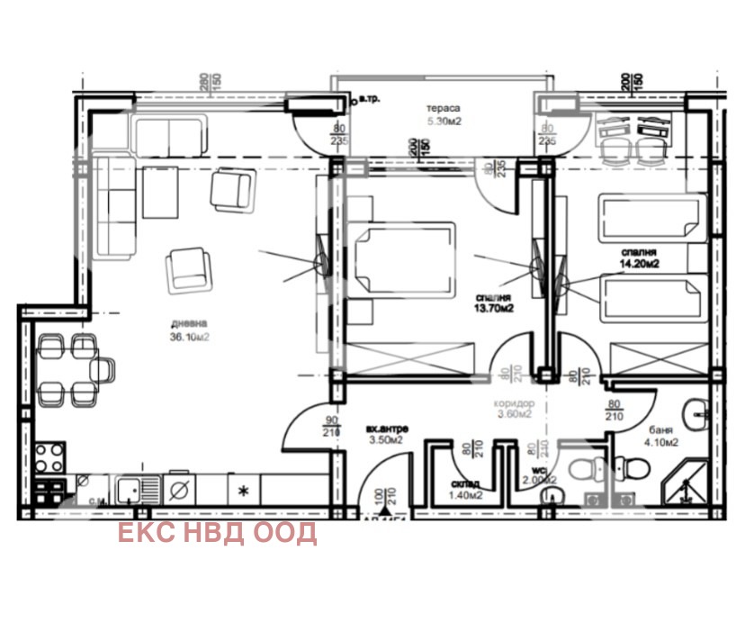 РАЗПРЕДЕЛЕНИЕ:входно антре ,склад,мокро помещение,баня с тоалетна ,две обширни спални с излаз към терасата и светъл просторен хол.