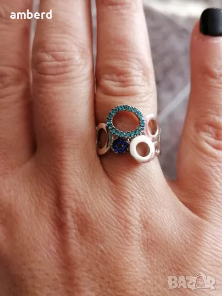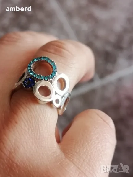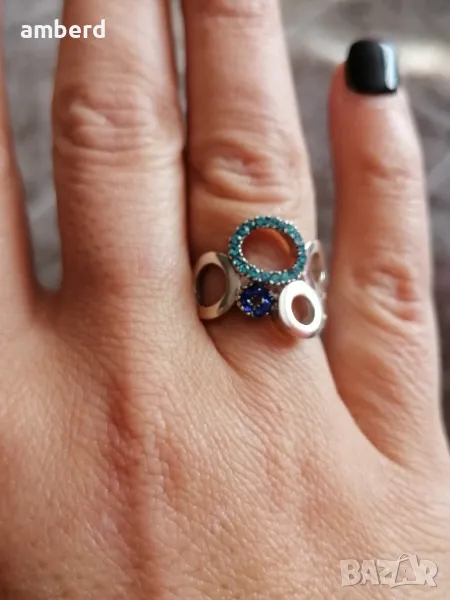 Много красив и елегантен пръстен, изработен от сребро проба 925 и 27 сини циркони. Вътрешен диаметър - 16.5мм. Тегло - 3.45гр. Можем да ви изработим този модел в желан от вас размер и цвят камъни.