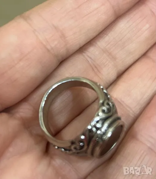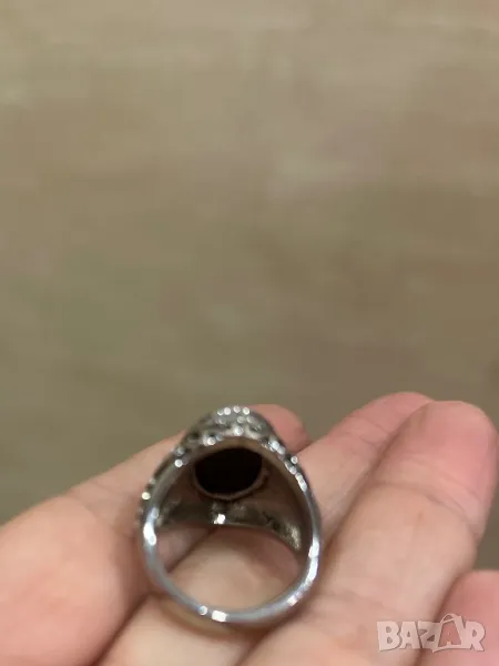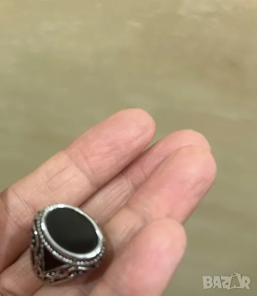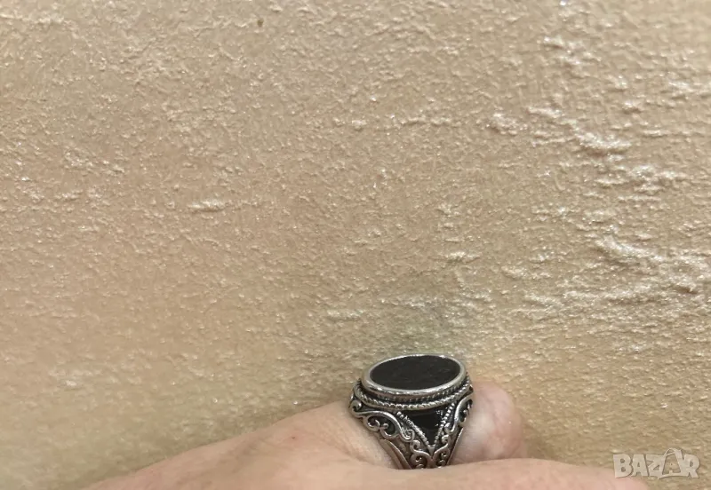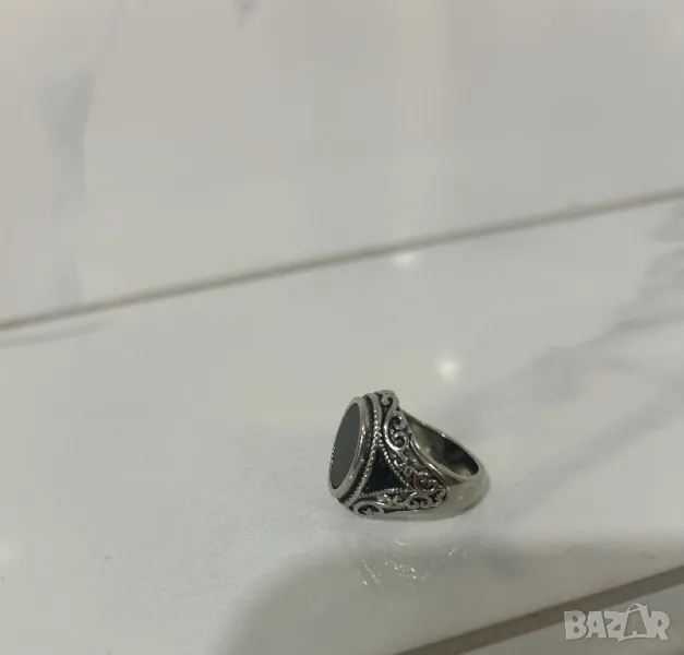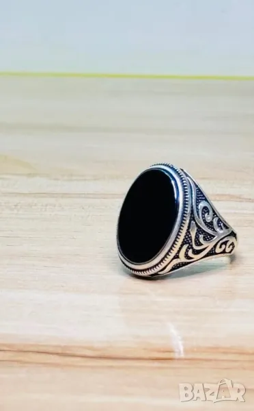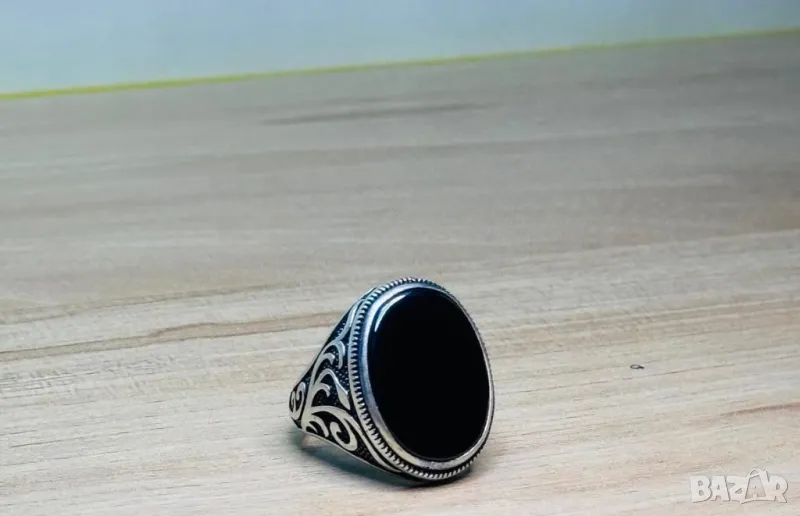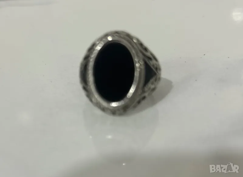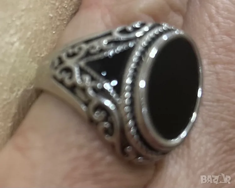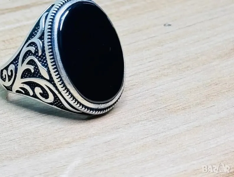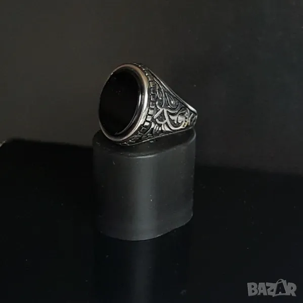 Пръстена е прецизно лазерно гравиран. С камък черен оникс – вид Халцедон.