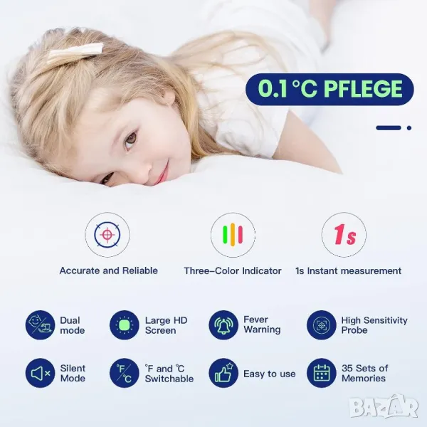 ИЗМЕРВАНЕ С ЕДИН БУТОН - Работа с един бутон, много лесна за използване. 3 цветно кодирана функция АЛАРМА ЗА ТРЕСКА, зелено означава нормална телесна температура, оранжево означава лека треска и червено означава висока температура.