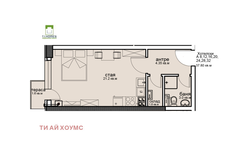 Едностайният апартамент разполага с функционално разпределение, осигуряващо максимален комфорт.
