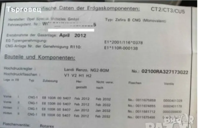 Метанова бутилка свалена от Опел Зафира 2012 година в комплект с евро електриески кран- клапан