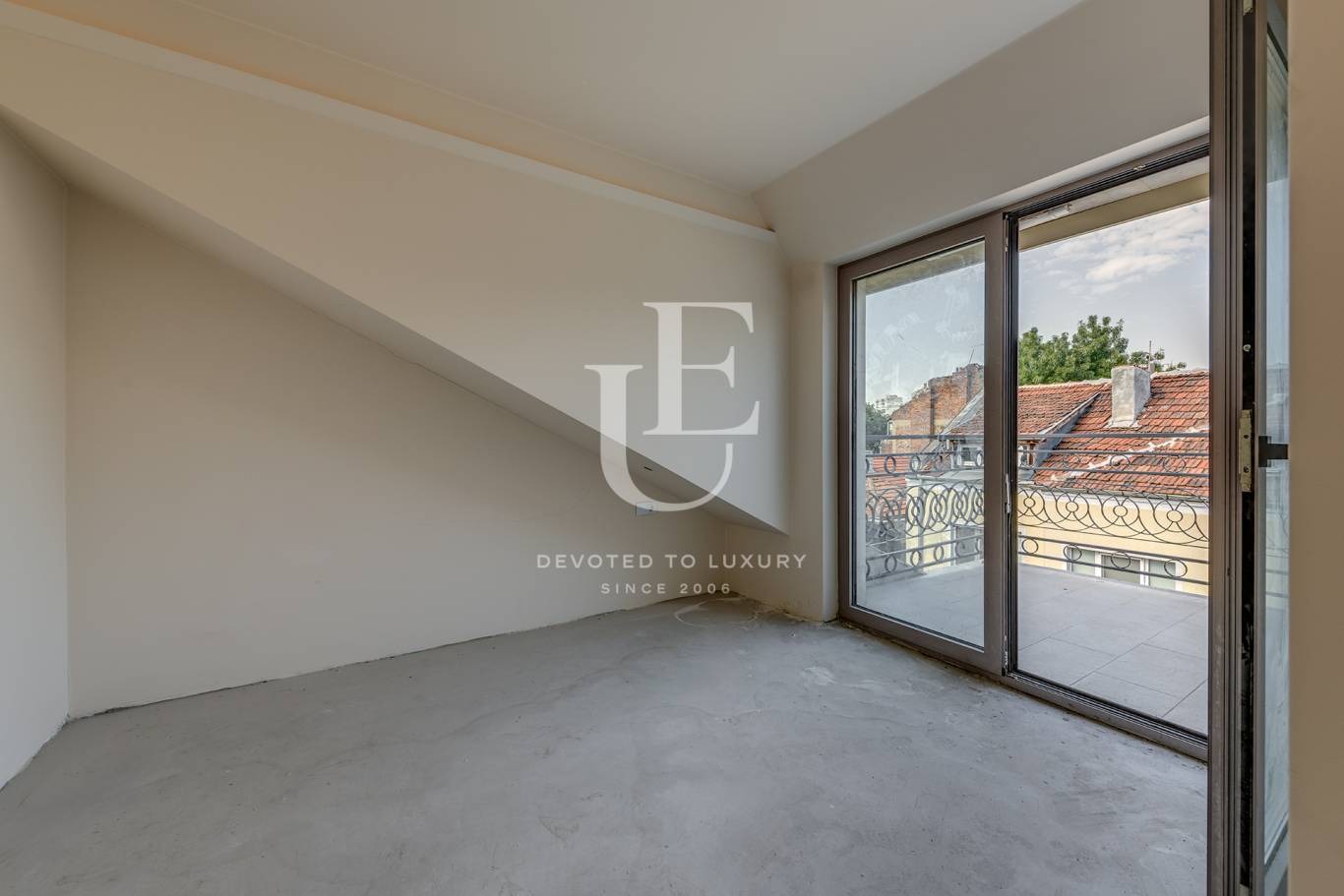 Unique Estates има удоволствието да Ви представи пентхаус за продажба на престижно централно място, на метри от НДК. Имотът е на шпакловка и замазка и разполага с голяма покривна тераса с гледка както към града, така и към планината. Предвид това, че разпределението е с тухлени прегради, то може да се променя според желанието на клиента. Отоплението е предвидено да бъде термопомпа. Сградата е построена през 2019 г. и е единствена по рода си с местоположението си, а общите части са изключително добре поддържани. Имотът се намира на пети етаж. Към него има две мазета, както и две паркоместа включени в цената.