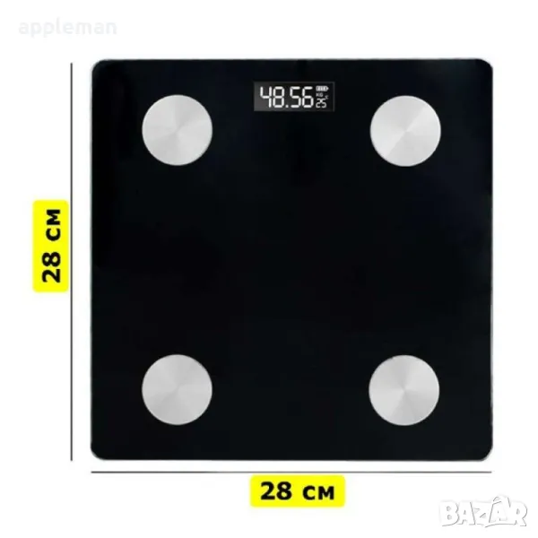 Интелигентна везна, електронна, с дигитален дисплей, изработена от защитено стъкло, нехлъзгаща се, приложение за телефон, Kg/Lb/St, максимално измерено тегло 180 Kg, работеща с батерии, черна