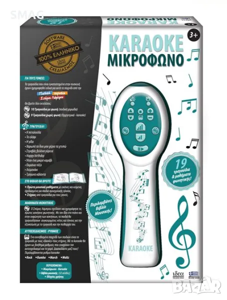Караоке микрофон и съпътстваща книга за първите уроци по музика с картинки и текстове. В диска ще чуете 19 любими детски песни в симфонична оркестрация и изпълнение на детски хор. Работи с 3 AA батерии (не са включени).