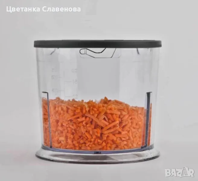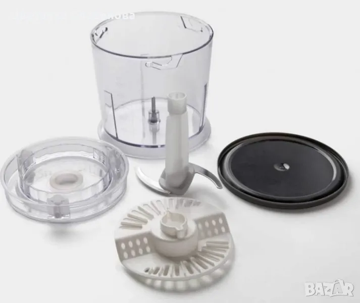 Чопърът има 1 работна скорост и също е оборудван с функцията Turbo, за бързо раздробяване. Разграфената купа с вместимост 500 мл не съдържа BPA и е снабдена с капак, за да поддържа храната свежа, така че тя няма да се окисли. Ножовете за рязане, изработени от неръждаема стомана, се свалят.