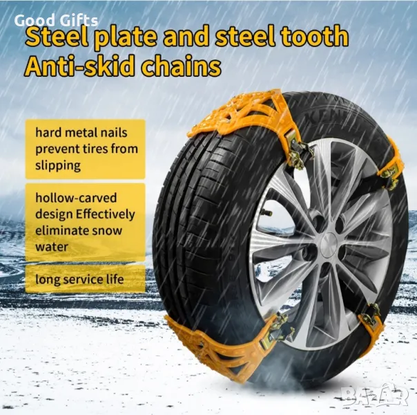 Веригите за сняг за автомобили могат да издържат на ниски температури. Тази автомобилна верига за сняг е изработена от първокласен материал и устойчиви на износване неплъзгащи се гвоздеи, което причинява по-нисък шум. Той е здрав и издържа на ниска температура от минус 50 градуса по Целзий.