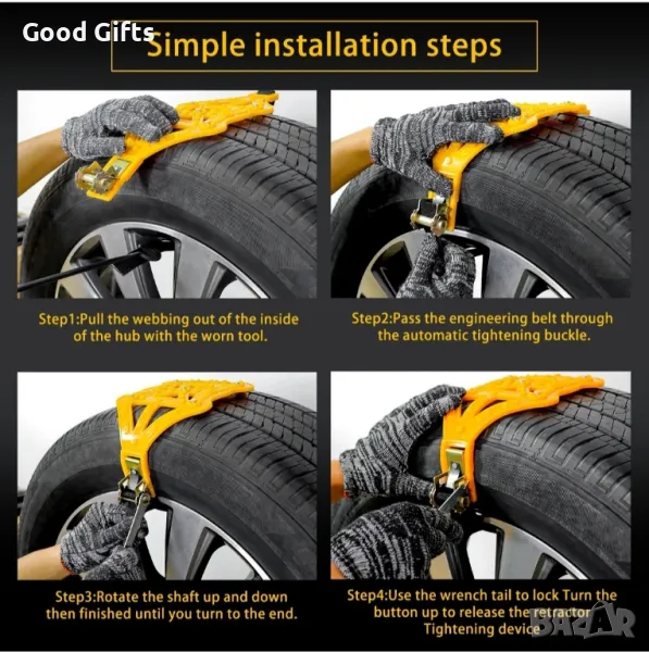 Лесно инсталиране и премахване: Без необходимост от преместване на автомобила, бързо инсталиране и премахване за минути. Лесно и ефективно решение за блокиране и инвалидност при всякакви терени и неблагоприятни условия. Аварийните вериги за гуми с регулируеми ремъци за опъване могат да направят монтирането на вашето устройство към гумата лесно. Веригите за гуми осигуряват добър контрол върху сняг, кал или пясък, което няма да повреди гумата и колелото, или пътя.