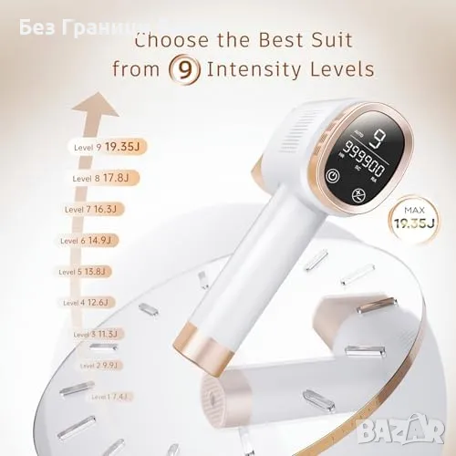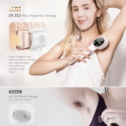 Мощна IPL технология: Максимална енергия от 19,35J за премахване на косми в дълбочина.