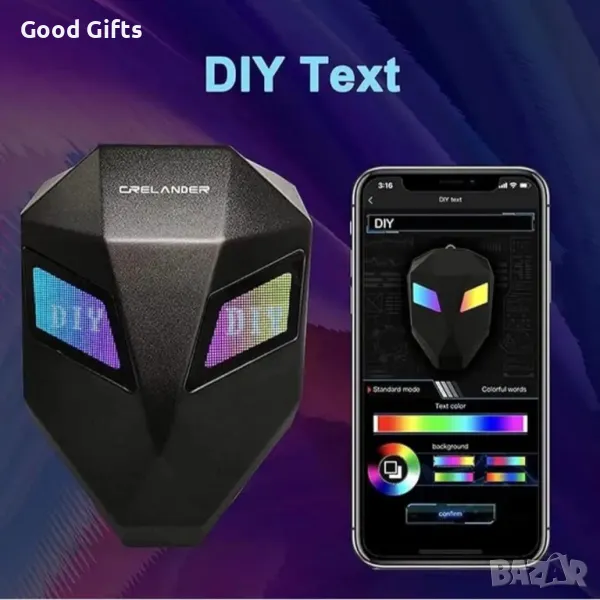 Изпълниението е с 3D форма на лице от твърда обвивка с 2 бр LED дисплея за очи.