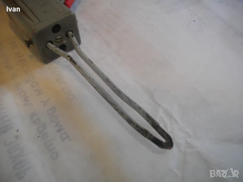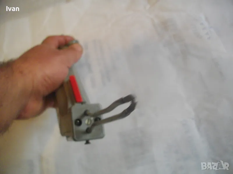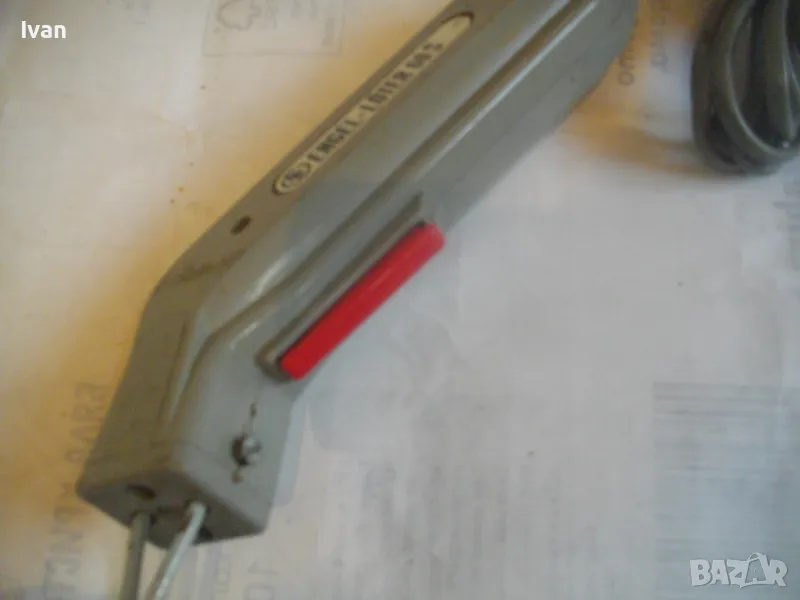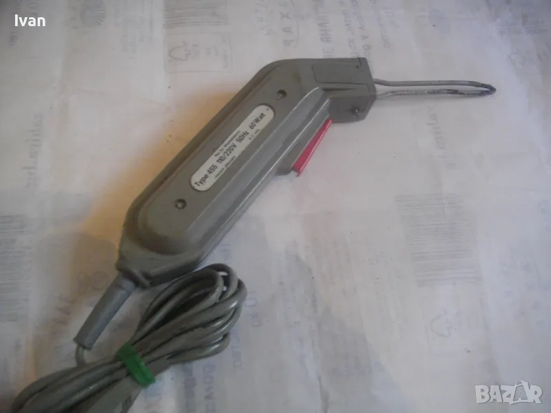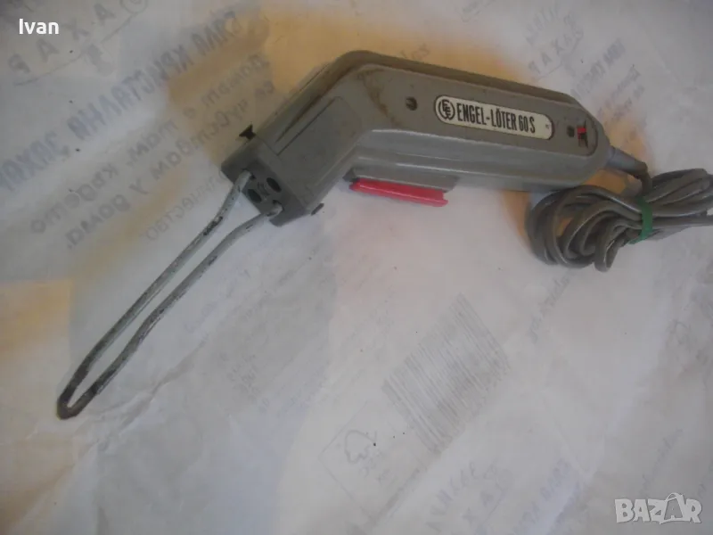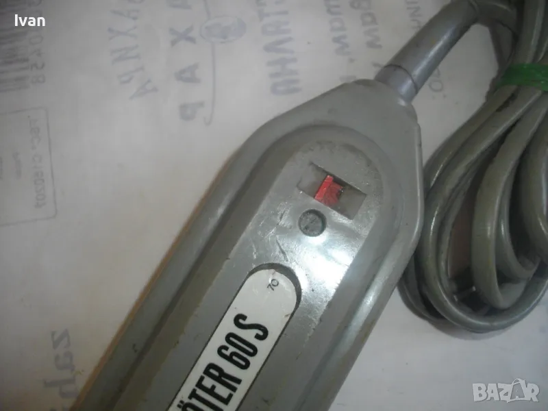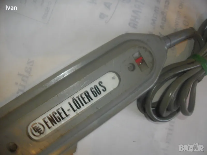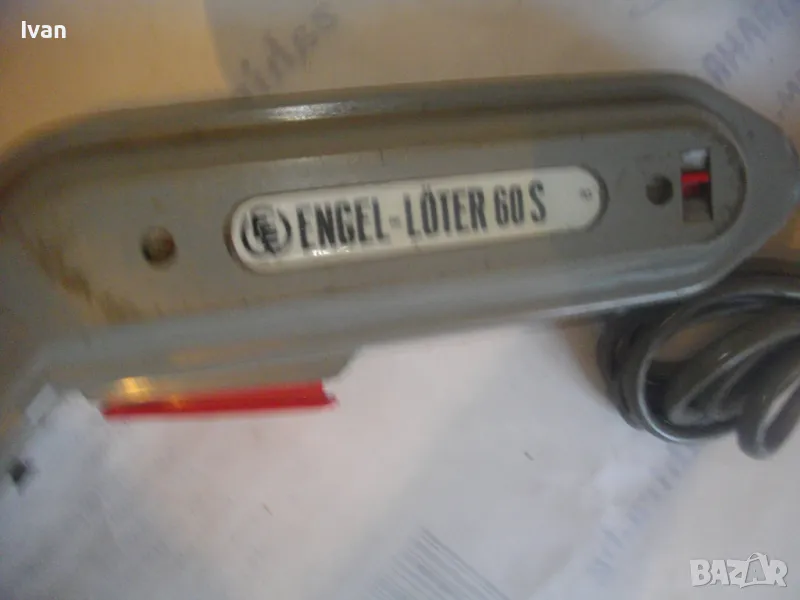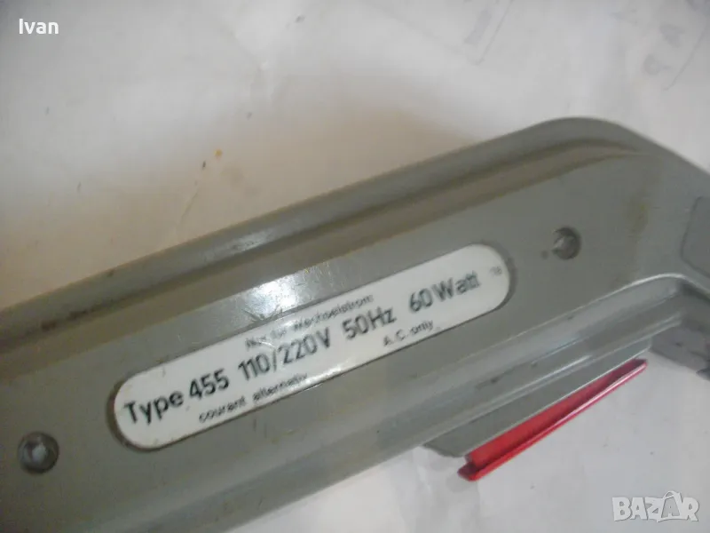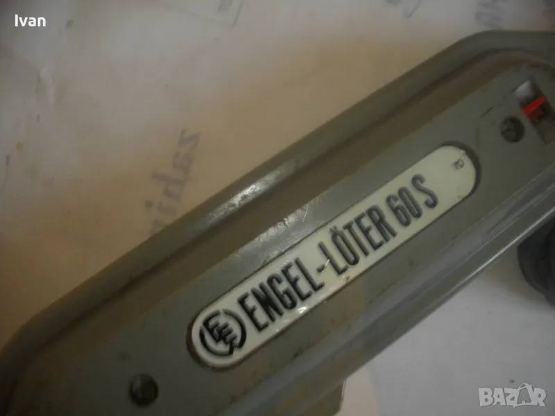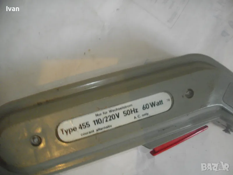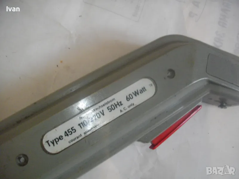 ОПИСАНИЕ на ел.лепачка за пластмаси - цена 19 лв. Машината е тип поялник за пластмаси, посредством дълга двойна човка. Старо качество производство. Запазен външен вид и отлочни работно/техническо съсотяние. Марка и модел -ENGEL_LOTER 60S Type 755 . Немска производство 1978 г. Западна Германия. Дължина човка - 105 мм, двойна човка. Страничен пусков ключ. Корпус - твърда пластмаса. Спусък голям и удобен, разположен отдору на корпуса. Дължина на машината без човката - 200 мм. Характерситики на машината - захранване 110/220 волта /работи и на 110 волта и на 220 волта, без допълнително устройство/. Мощност - 60 вата. Допълнителна маркировка - Nur Fur Wechselstrom.