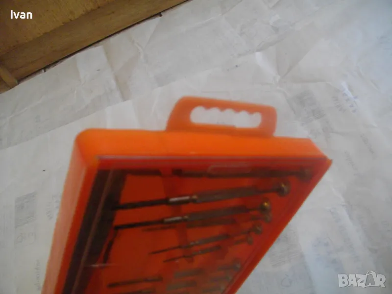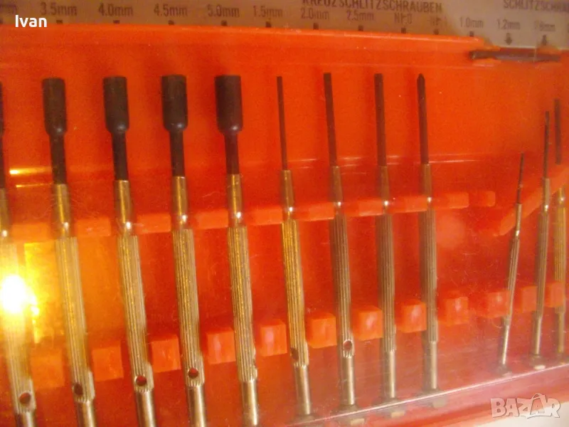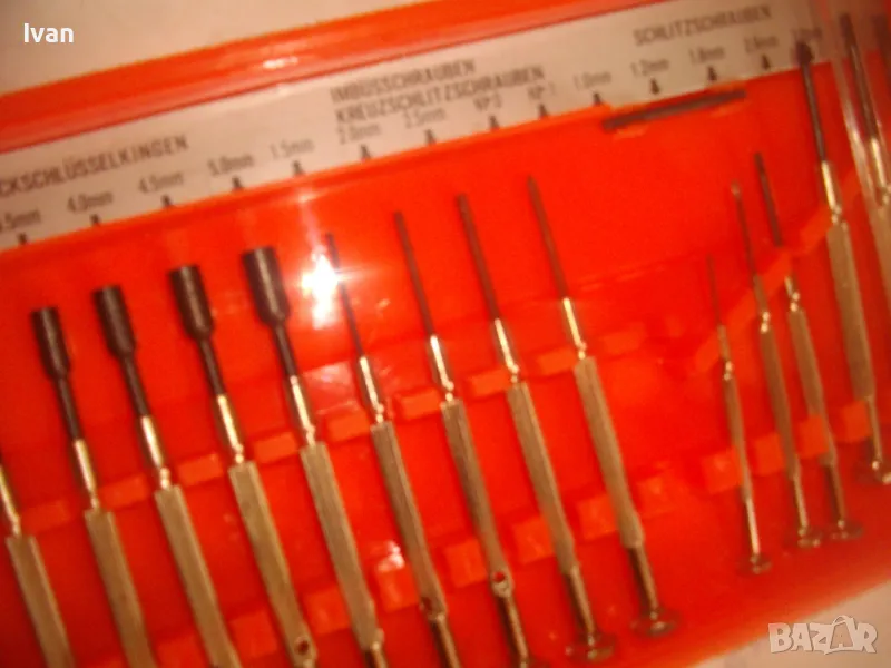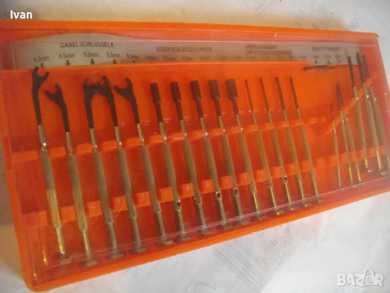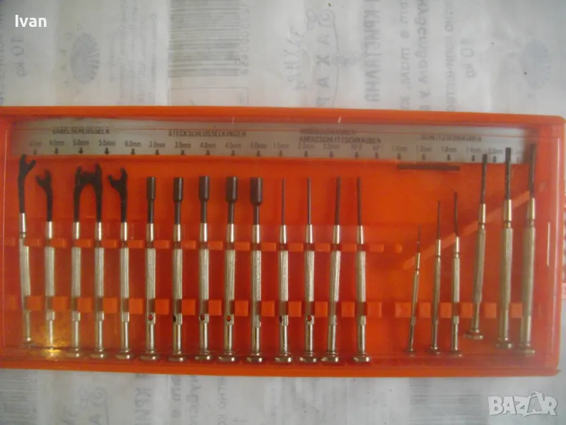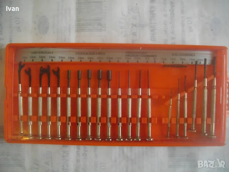 ОПИСАНИЕ на комплект 21 бр. специализирани мини и микро отвертки ръчни. Цена 99 лв. Съвсем нов, неизползван комплект различни захвати отвертки, включително и захвати тип гаечен ключ и тип глух клъч за работи при микроелектроника. Комплекта е немски оригинален, с немски маркировки и означения. В оранжеева ПВЦ кутия с възможност за окачване на стена и с размери на кутията - 330 х 140 х 20 мм. Комплектът вкючва 20 отвертки и 1 бр. сменяемо острие, от които 5 бр. отвертки са специализирани със захват ключе, 5 бр. отвертки тип глух ключ, 7 бр. отвертки дълго острие, 3 бр. отвертки късо острие, 1 бр. резервно късо острие. Всички остриета са от закалена хромванадиум стомана. Специализираните отвертки тип ключе са за кабел - надписи Cabelschlusselk - размери 4,0 мм, 4,5 мм, 5,0 мм, 5,5 мм, 6,0 мм. Отвертките тип глух ключ са Steckshusselkingen с размери 3,0 мм, 3,5 мм, 4,0 мм, 4,5 мм, 5,0 мм, 1,5 мм. Специализираните дълги отвертки тънки са Imbusschrauben Kreuzschlitzschrauben с размери 2,0 мм, 2,5 мм, №0. Отвертките специализирани къси тънки микро са Schlitzschrauben с размери 1,2 мм, 1,8 мм, 2,4 мм, 3,0 мм, 3,5 мм. Резервното острие е 1 бр. късо тънко с размер 1,0 мм. Цената на комплекта отвертки е 99 лв - твърда/крайна/без коментар.