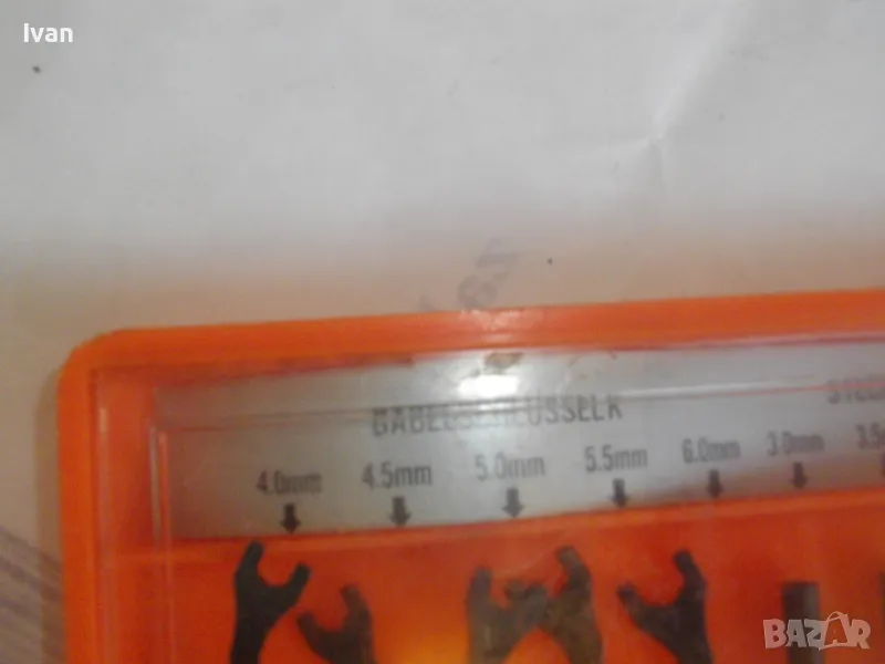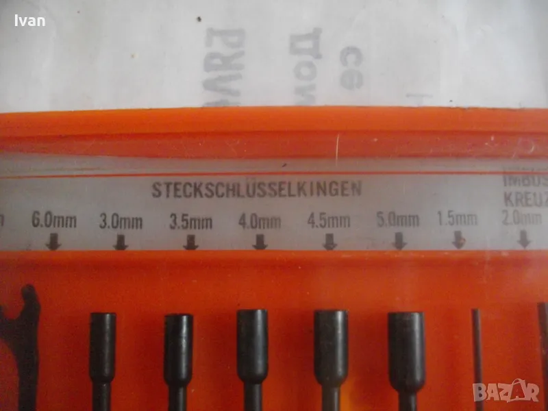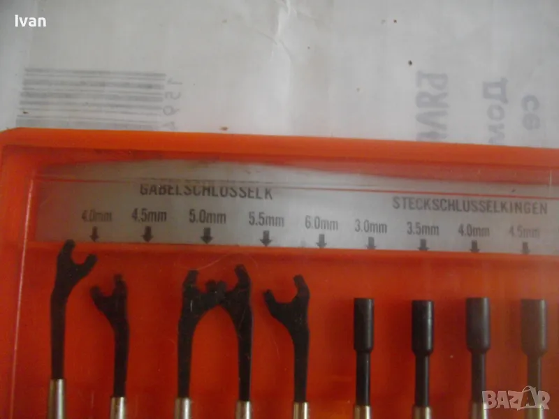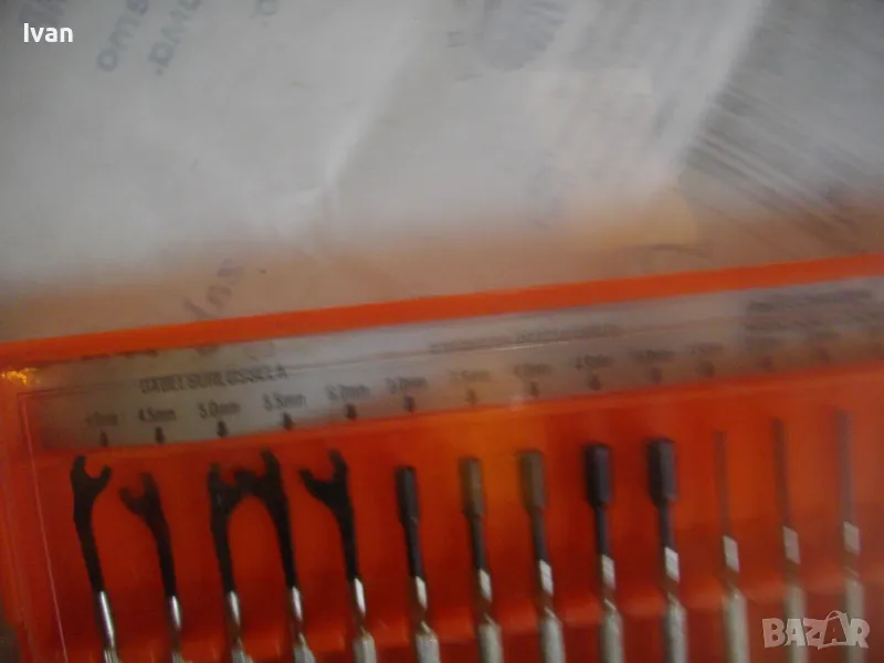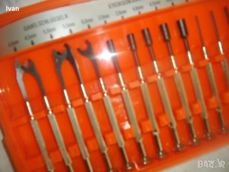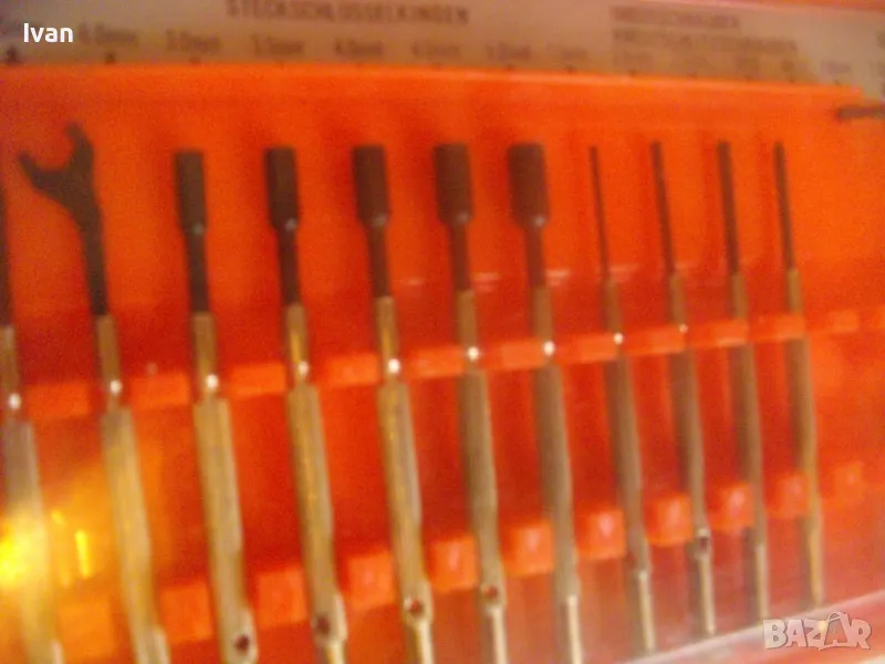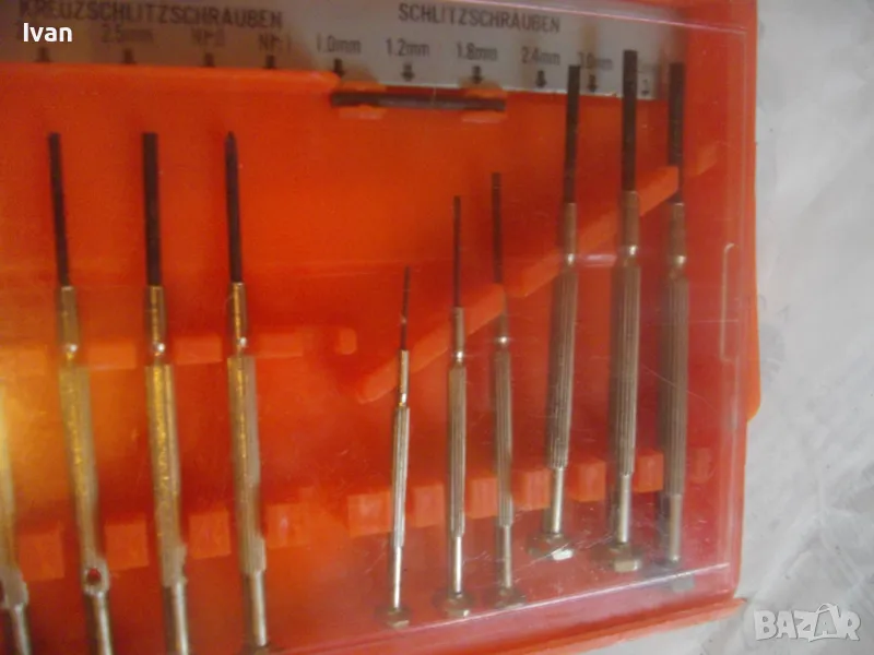 ОПИСАНИЕ на комплект 21 бр. специализирани мини и микро отвертки ръчни. Цена 99 лв. Съвсем нов, неизползван комплект различни захвати отвертки, включително и захвати тип гаечен ключ и тип глух клъч за работи при микроелектроника. Комплекта е немски оригинален, с немски маркировки и означения. В оранжеева ПВЦ кутия с възможност за окачване на стена и с размери на кутията - 330 х 140 х 20 мм. Комплектът вкючва 20 отвертки и 1 бр. сменяемо острие, от които 5 бр. отвертки са специализирани със захват ключе, 5 бр. отвертки тип глух ключ, 7 бр. отвертки дълго острие, 3 бр. отвертки късо острие, 1 бр. резервно късо острие. Всички остриета са от закалена хромванадиум стомана. Специализираните отвертки тип ключе са за кабел - надписи Cabelschlusselk - размери 4,0 мм, 4,5 мм, 5,0 мм, 5,5 мм, 6,0 мм. Отвертките тип глух ключ са Steckshusselkingen с размери 3,0 мм, 3,5 мм, 4,0 мм, 4,5 мм, 5,0 мм, 1,5 мм. Специализираните дълги отвертки тънки са Imbusschrauben Kreuzschlitzschrauben с размери 2,0 мм, 2,5 мм, №0. Отвертките специализирани къси тънки микро са Schlitzschrauben с размери 1,2 мм, 1,8 мм, 2,4 мм, 3,0 мм, 3,5 мм. Резервното острие е 1 бр. късо тънко с размер 1,0 мм. Цената на комплекта отвертки е 99 лв - твърда/крайна/без коментар.