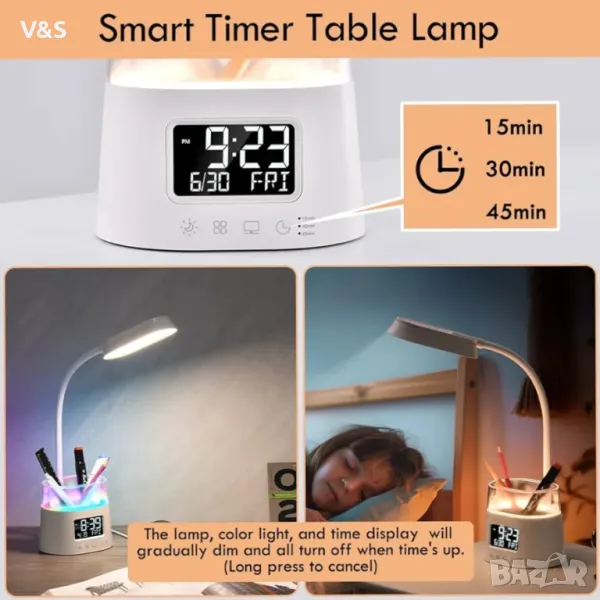 Интелигентно управление на времето: Следете графика си с вградения дисплей на часовника. Задайте един от трите таймера (15, 30 или 45 минути) за автоматично изключване на лампата, което ви помага да останете фокусирани и да се справите със задачата. Дисплеят за време също разполага с 3 нива на яркост за удобно гледане, като гарантира, че сънят ви няма да бъде нарушен от прекомерната яркост на екрана през нощта.