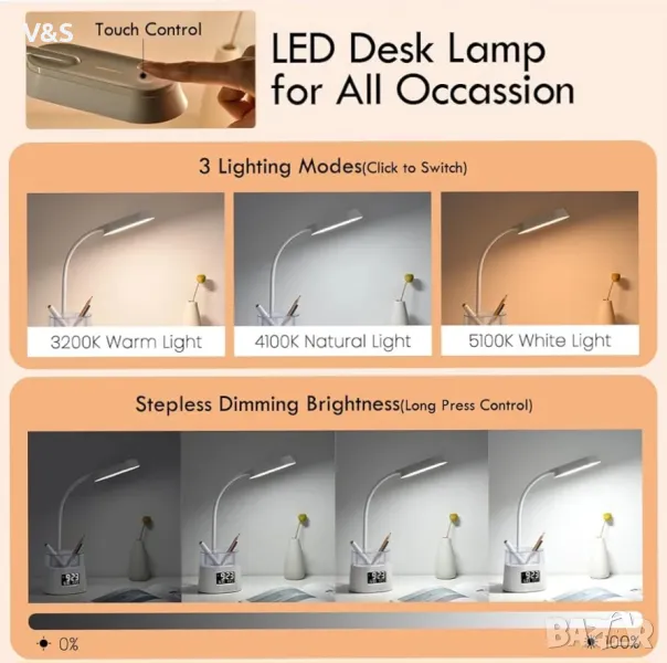 3 цветови температури и безстепенно затъмняване: С тази LED настолна лампа можете да избирате между топла бяла, студена бяла и естествена бяла светлина и лесно да регулирате яркостта чрез продължително натискане на бутона за превключване. Това е страхотна настолна лампа за четене, учене, работа, сън и др.