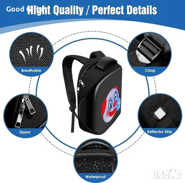 LED раница с пълноцветен екран,Можете да управлявате екрана на дисплея чрез APP и да променяте изображенията за постоянно, Направи си сам творчество с интересни изображения, обичани от мотоциклетистите.