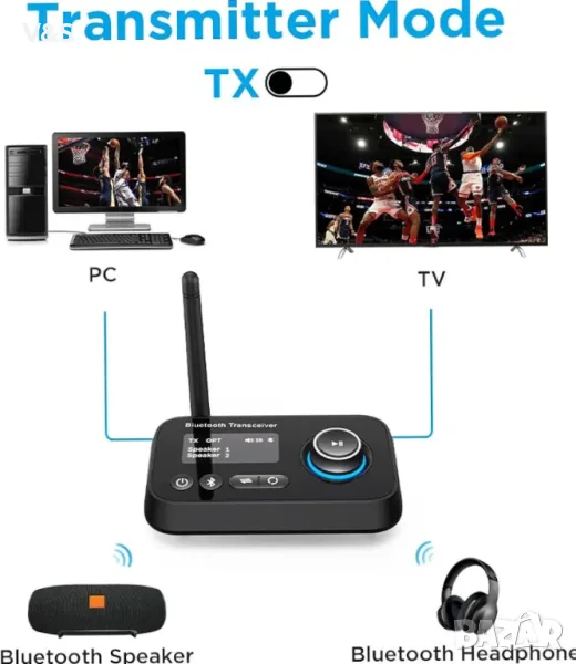 Bluetooth трансмитер приемник 3-в-1 Bluetooth 5.0 аудио адаптер за 2 слушалки с байпас контрол на си