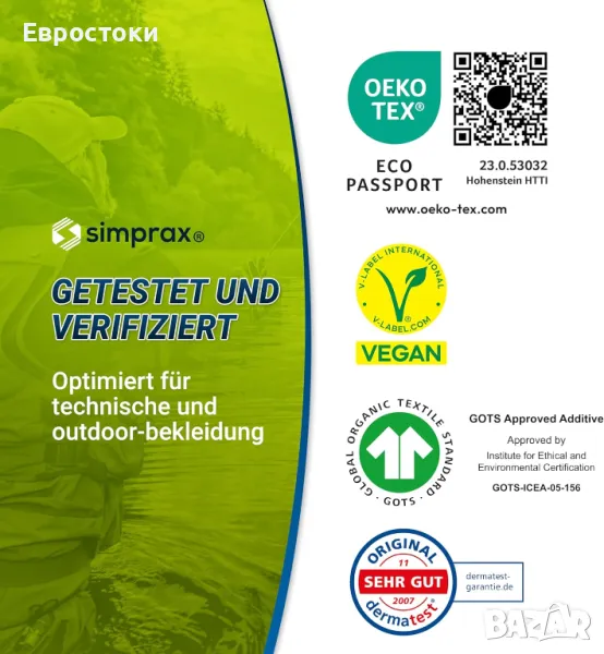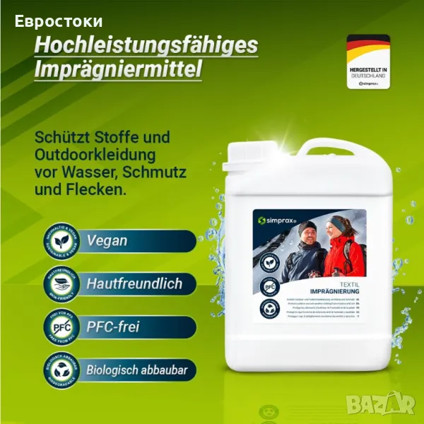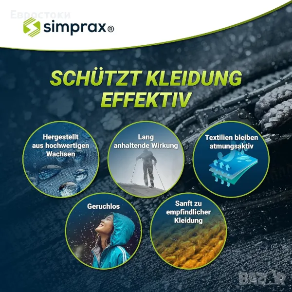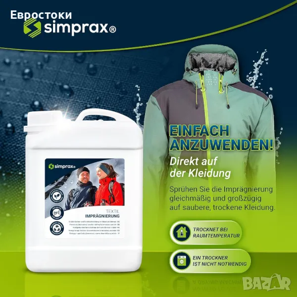 Simprax® Текстилна импрегнация - Устойчив хидроизолационен раствор за външен и функционален текстил - Gore-Tex | Sympatex | Softshell - Oeko-Tex Certified | Одобрено от GOTS - Без пропелантни газове