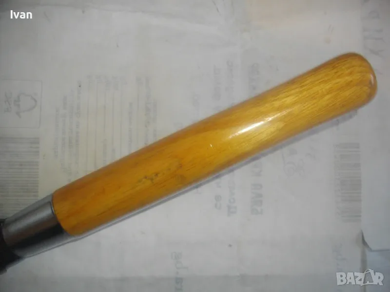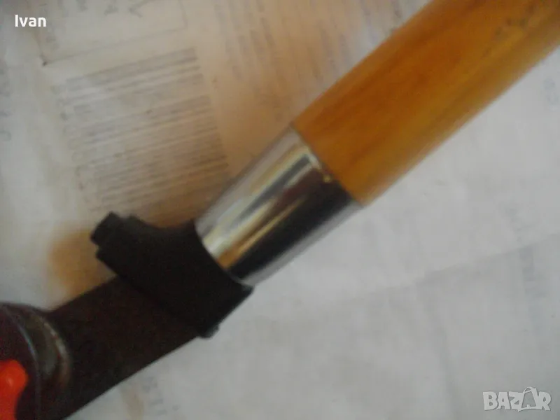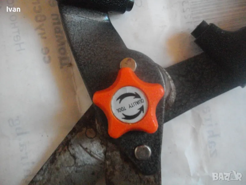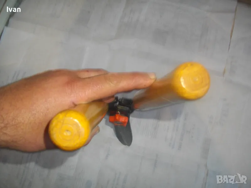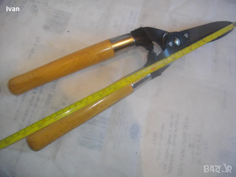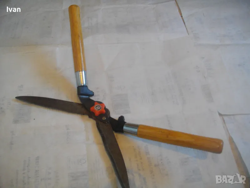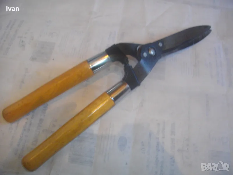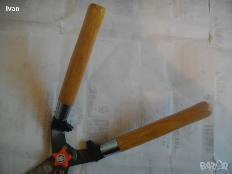 ОПИСАНИЕ НА МАСИВНА НОЖИЦА с дървени дръжки и регулация отваряне остриета - 159 лв. Тип градинска за рязане на храсти, клони и всякакви други твърди и меки неметални повърхности като платове, кожа, гьон, гума, табак и твърди кадастрони и пр. Нова, неизползвана и неупотребявана. Немско производство. Цялостна дължина 510 мм, остриета дължина 210 мм. Стоманена глава. Регулатор отваряне остриета, разположен на главата. Стопер на дръжките да не се прехвърлят остриетата при рязане едно върху друго.
