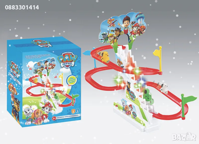 Комплектът включва пързалка, три знамена и три кученца от популярния анимационен сериал.
