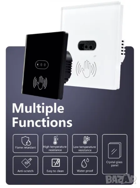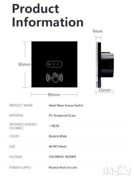 Безконтактен ключ, със задействане от 3 до 10 см разстояние. Идеален е за монтаж на места, където е необходимо да се избягва докосването на превключвателя.