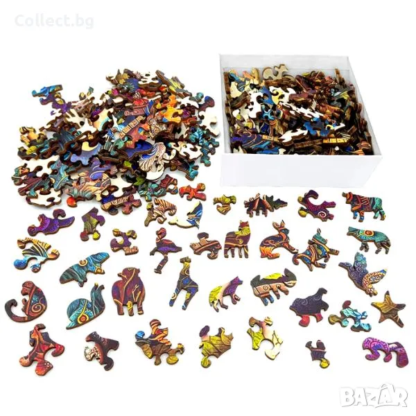 Многоцветен дървен пъзел, някои от парчетата са специфично изрязани под формата на животни.