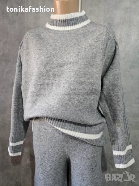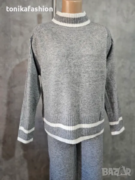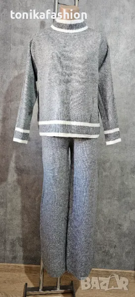 Блуза свободна кройка с паднало рамо и райета. Панталон с висока талия подчертаващ ханша и прав крачол. Универсален размер подходящ за s и m. Цвят сив