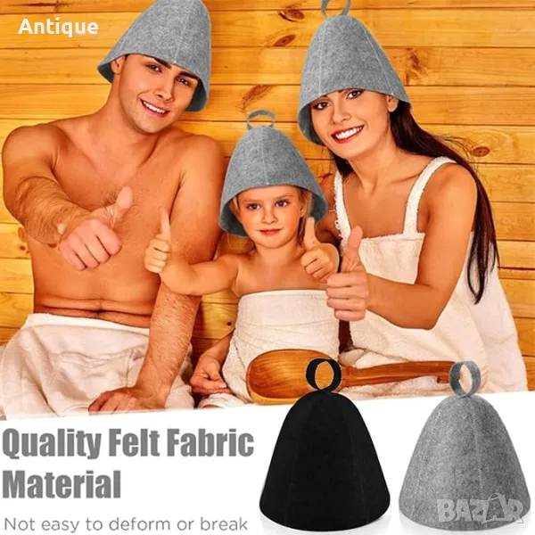 Шапка за сауна, изработена от органичен вълнен филц. Този продукт е с уникални качества. Предпазва главата от прегряване, което позволява удължен престой в сауната, без да ви прилошее. Вълната изолира мозъка от високата температура и не позволява рязък спад на кръвното налягане, което е основен проблем за много хора. Вторият ефект на шапките за сауна е, че предпазват косата от изсушаване и съхраняват формата на прическата. Когато излезнете от сауната и свалите шапката си, косата ви ще бъде в същия прекрасен вид, в който е била преди да влезнете в сауната. През зимата може да се използва на открити топли басейни, като по този начин ще предпазва и топли главата Ви при дъжд и сняг. Всички шапки са с универсален размер, пасващ както на деца, така и на възрастни.