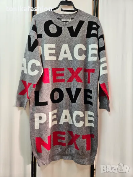 Рокля от стегнато и плътно, гладко плетиво в сив цвят с надписи. Модела е права свободна кройка с паднало рамо.