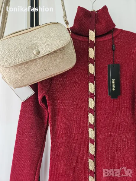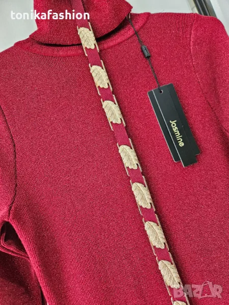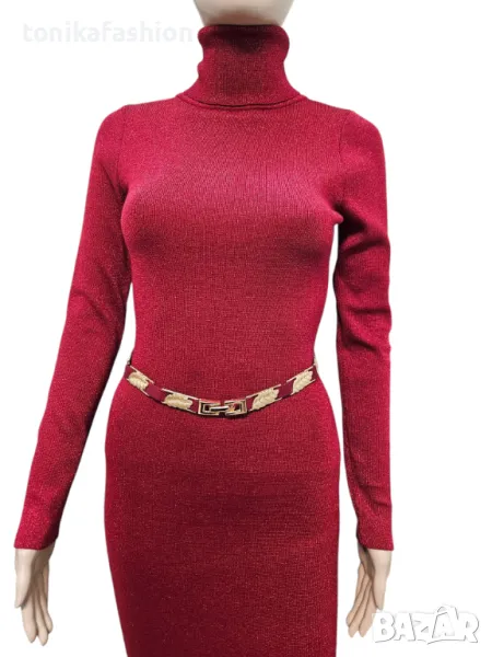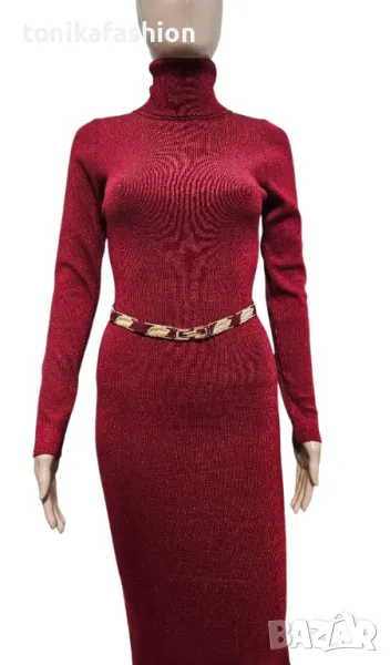 Червена рокля от стегнато плетиво с ламе /не боцка/. Втален модел, силно подчертаващ фигурата, миди дължина и висока поло яка. Подвижен ластичен колан със златни пластини. Универсален размер подходящ за xs,s,m.