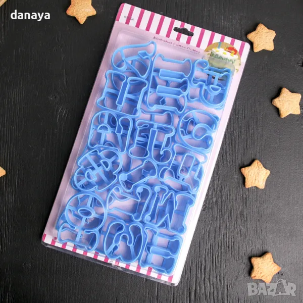 формички за сладки български букви. Форми за сладки Азбука. Чудесни са за приготвяне на вкусни бисквитки, курабийки и други сладки изкушения от тесто. Може да ги използвате върху тесто, захарно тесто, фондан и други. Идеални са и за декориране на торти и сладкиши с желан надпис – ЧРД, Имен ден, изписване на имена и тн.