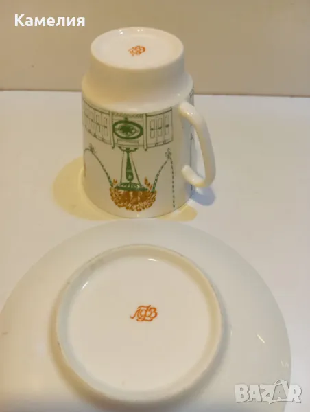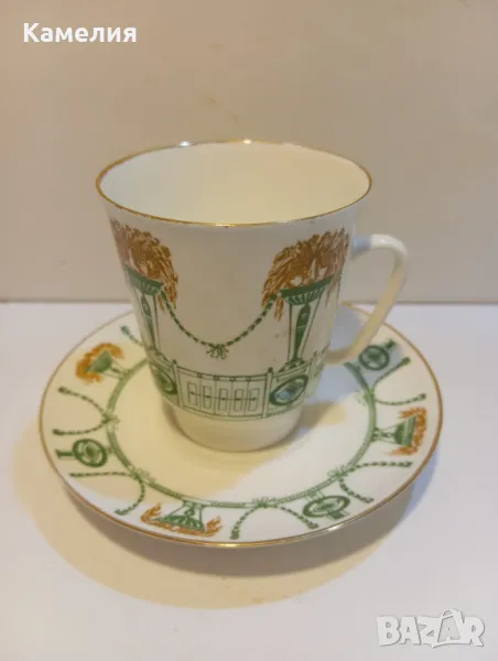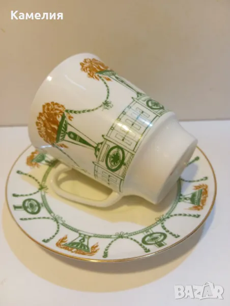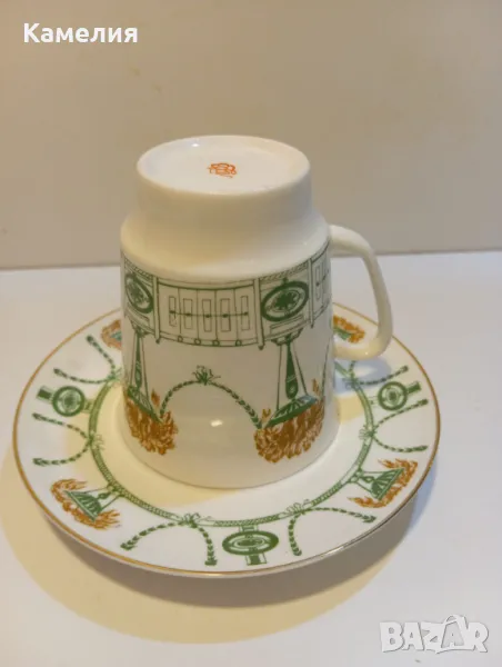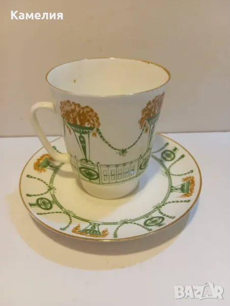 Руска порцелановамсети за кафе ( чай) Лятна градина. Произведен е през 70-те години ЛФЗ. Тя има много успешна форма, наречена "май" и е изобретена от Едуард Кримър, ученик на Казимир Малевич. Тези чаши са посветени на Лятната градина на Санкт Петербург. Костен порцелан. Много лек. Първо качество, червен печат. Чаша 170 мл до ръбче, чинийка 12 см. Чаша е с пукнатина, чинийка без забележки. За декорация или колекции.