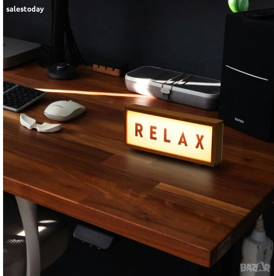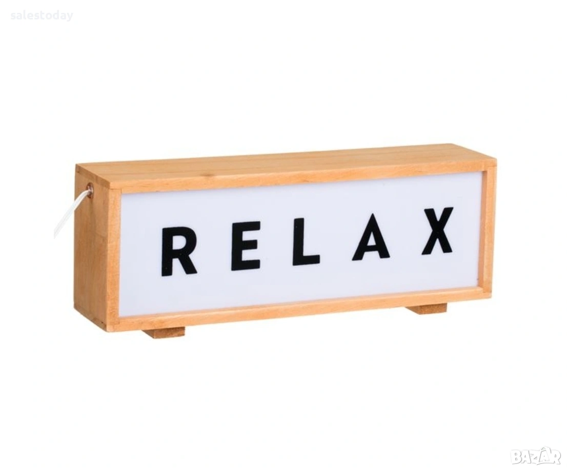 Декоративна настолна лампа със светещ надпис „RELAX“, идеална за създаване на топла и релаксираща атмосфера във вашето пространство. Отличава се с елегантен правоъгълен дизайн с дървена рамка и меко топло LED осветление, което осигурява приятна светлина, без да натоварва очите. Работи с USB кабел (1,5 м) (включен).