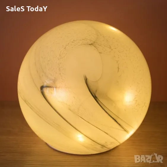 Стъклена настолна лампа на батерии, лампа с 12 led светлини, в бял мраморен дизайн, във формата на топка. Съдържа бутон за включване/изключване. Работи с 3 AA батерии (не са включени).